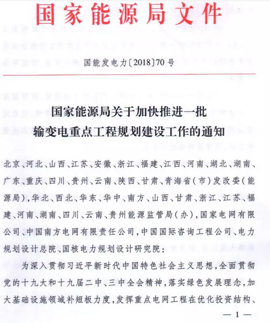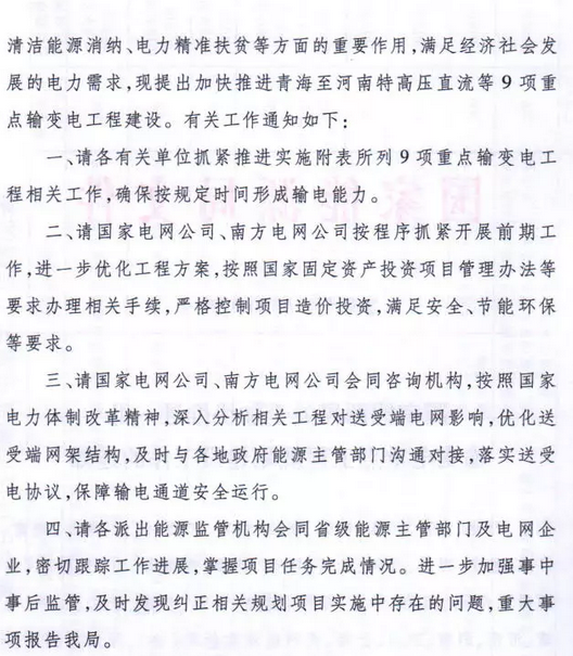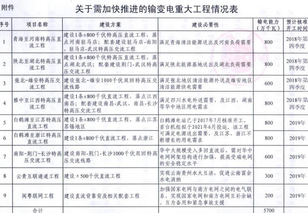 9月7日獲悉,國家能源局印發(fā)《關(guān)于加快推進(jìn)一批輸變電重點(diǎn)工程規(guī)劃建設(shè)工作的通知》國能發(fā)電力〔2018〕70號,《通知》指出,為加大基礎(chǔ)設(shè)施領(lǐng)域補(bǔ)短板力度,發(fā)揮重點(diǎn)電網(wǎng)工程在優(yōu)化投資結(jié)構(gòu)、清潔能源消納、電力精準(zhǔn)扶貧等方面的重要作用,加快推進(jìn)青海至河南特高壓直流、白鶴灘至江蘇、白鶴灘至浙江特高壓直流等9項(xiàng)重點(diǎn)輸變電工程建設(shè),合計輸電能力5700萬千瓦(工程見附件)。