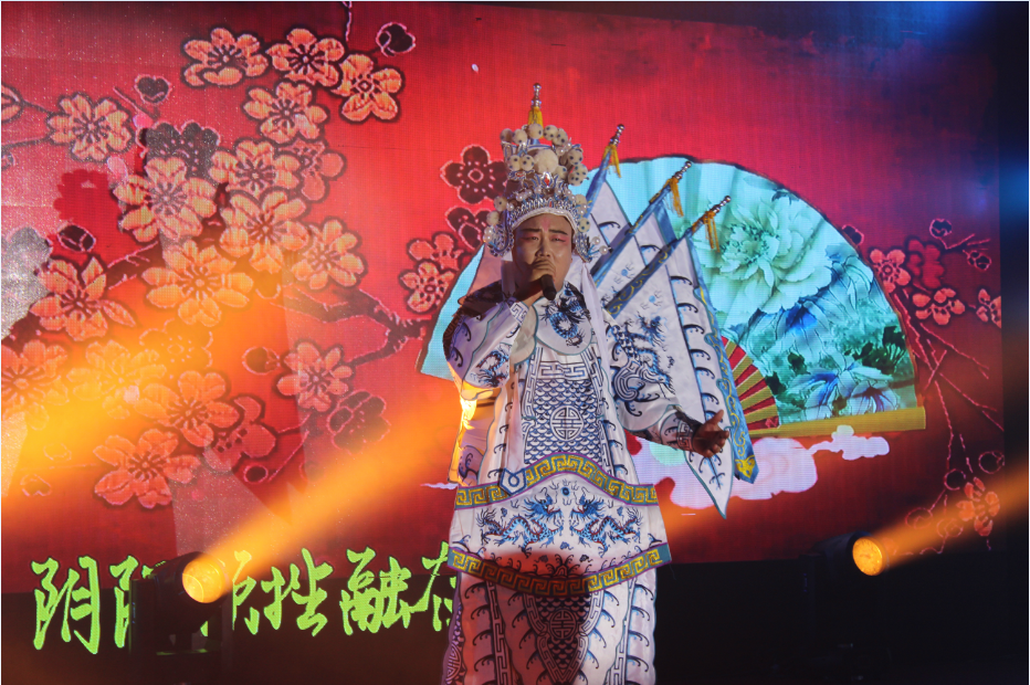 第二個(gè)節(jié)目是由牛懷賓帶來的《粉墨人生》,他身著戲袍,走著臺(tái)步,為偉大的信橋慶生。