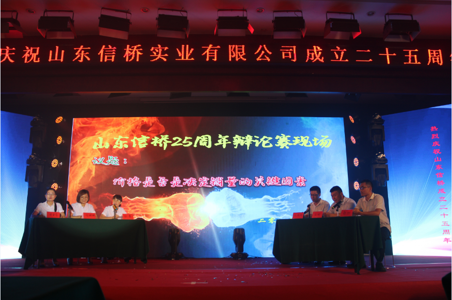 第五個(gè)節(jié)目是由信橋男生隊(duì)王丙丙、高雨、郭帥,女生隊(duì)徐賽、劉琳琳、宋金萍,客串周廣超、趙文玲帶來的《辯論賽》,辯論主題是價(jià)格是否是決定銷量的關(guān)鍵因素,雙方辯手就自己的觀點(diǎn)展開了激烈的討論,最后全體辯手共同朗誦《沁園春·信橋》。
