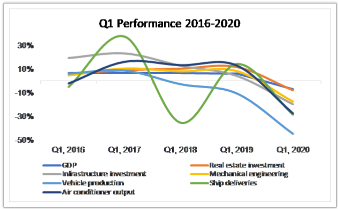 其中包括:GDP下降6.8%,房地產(chǎn)投資下降7.7%,基建投資下降19.7%,通用機(jī)械下降17.2%,汽車(chē)產(chǎn)量下降44.6%,船舶交貨量下降28.5%,空調(diào)產(chǎn)量下降27.5%。